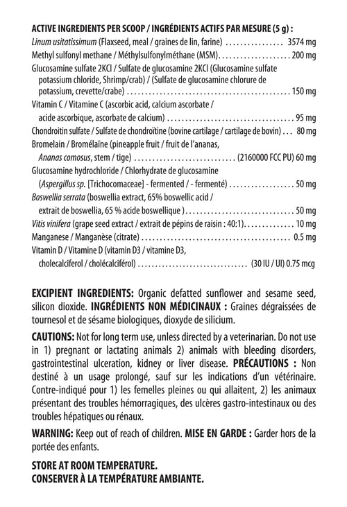 Supplying 200 mg of MSM, 200 mg of glucosamine complex (sulfate, hydrochloride) and 80 mg of chondroitin per 5 g scoop (used for each 20 lb of animal’s body weight), BioJOINT contains a blend of powerful antioxidants, vitamins and herbs that facilitate a healthy inflammatory response and support healthy joint function.