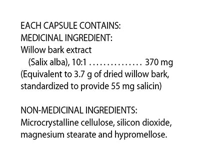 Willow bark extract (Salix alba), 10:1 . . . . . . . . . . . . 370 mg (Equivalent to 3.7 g of dried willow bark, standardized to provide 55 mg salicin)