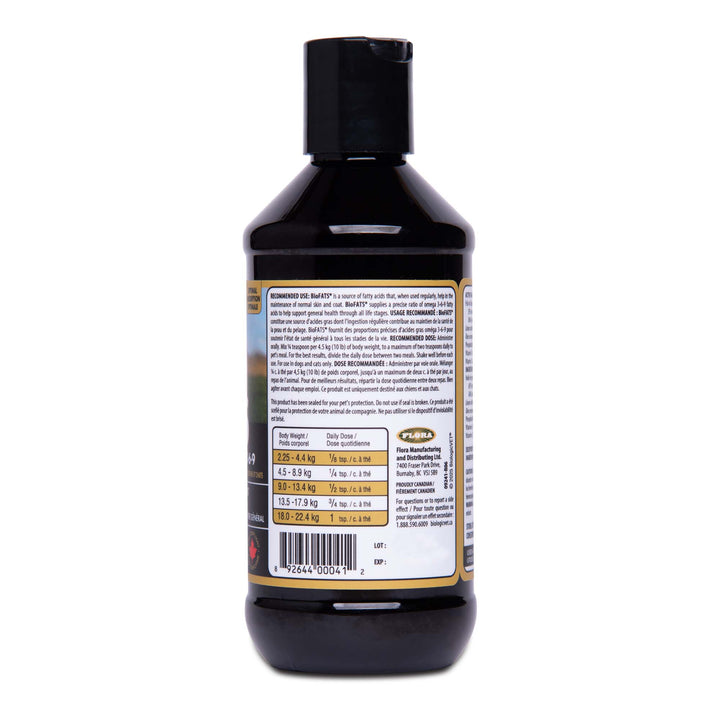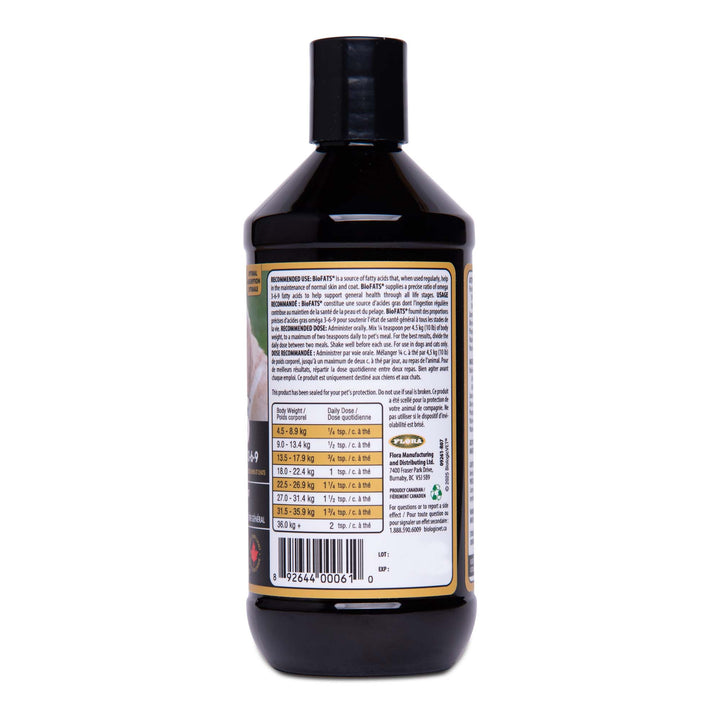 RECOMMENDED USE: BioFATS® is a source of fatty acids that, when used regularly, help in the maintenance of normal skin and coat. BioFATS® supplies a precise ratio of omega 3-6-9 fatty acids to help support general health through all life stages. USAGE RECOMMANDÉ : BioFATS® constitue une source d’acides gras dont l’ingestion régulière contribue au maintien de la santé de la peau et du pelage. BioFATS® fournit des proportions précises d’acides gras oméga 3-6-9 pour soutenir l’état de santé général à tous les stades de la vie.