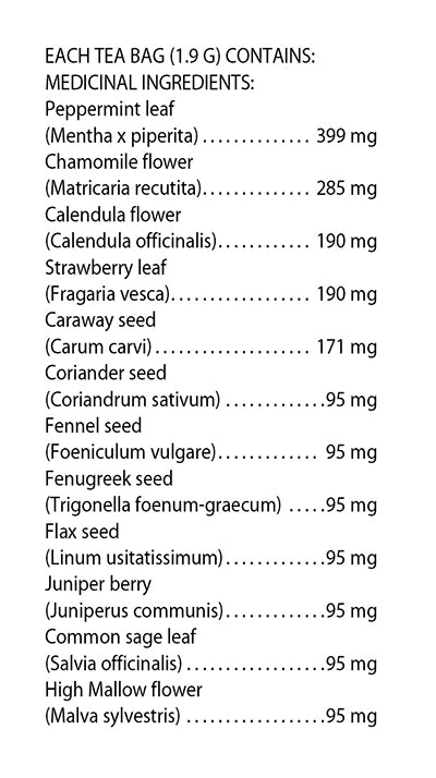 Ce mélange minutieusement préparé propose une combinaison réconfortante d’ingrédients traditionnellement utilisés en phytothérapie comme aide à la digestion, dont les feuilles de menthe poivrée calmante, la camomille apaisante et la fleur de calendula.